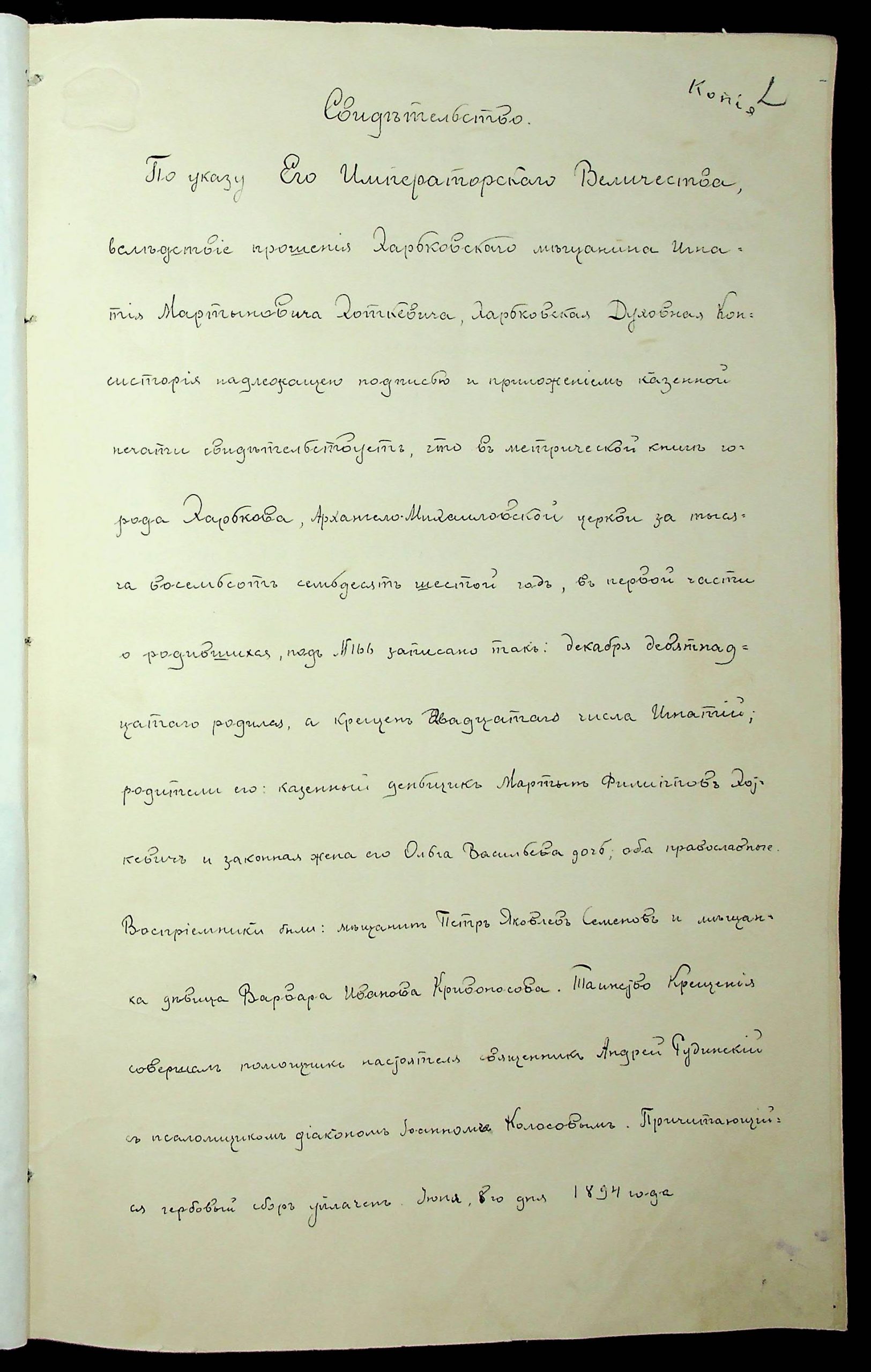 - Копія свідоцтва (виписки) про народження Гната Хоткевича. ф.770, оп.2, спр.2097, арк.2.