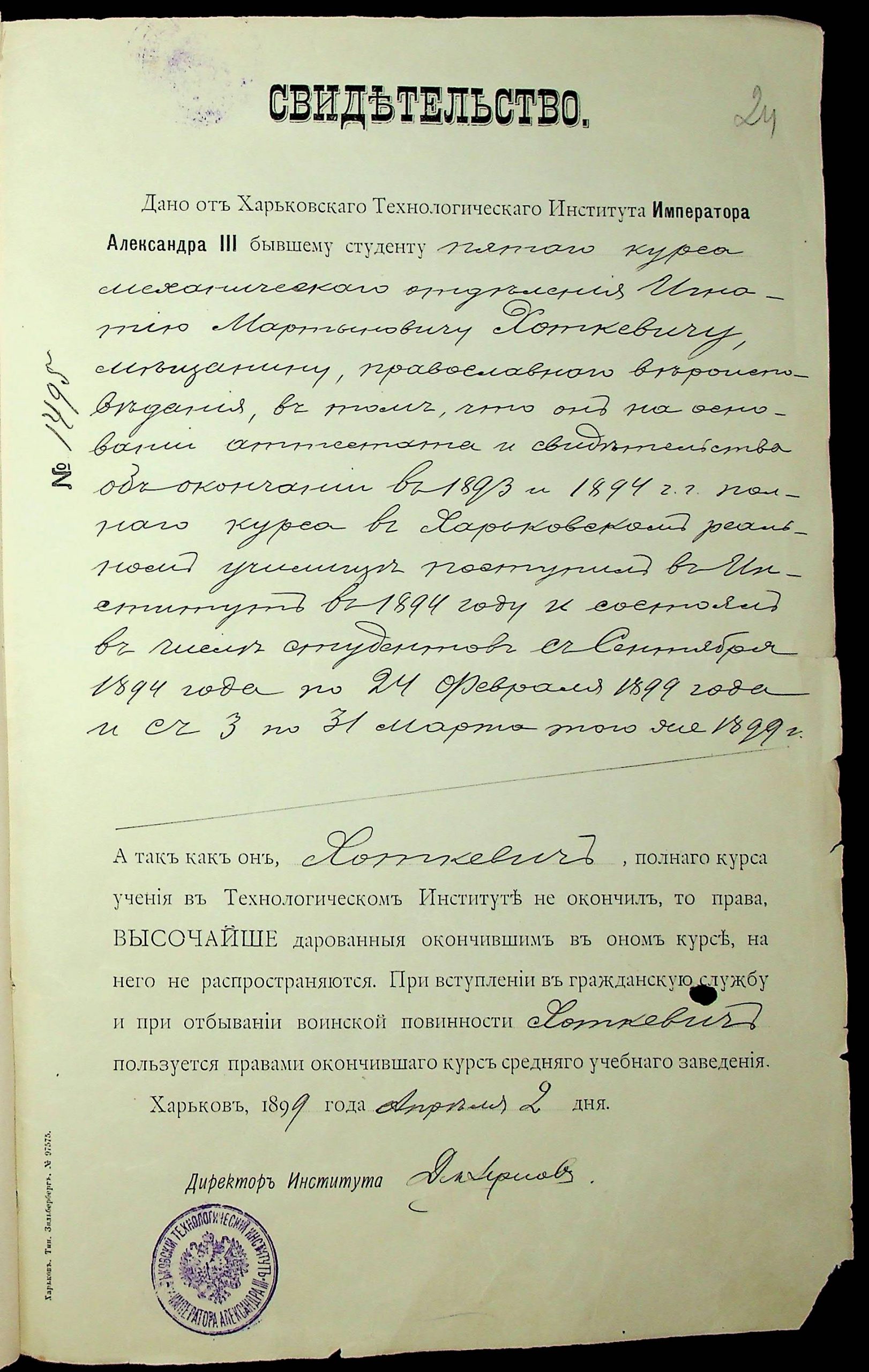 - Тимчасове свідоцтво Харківського технологічного інституту. 1900 рік. ф.770, оп.2, спр.2097, арк.23.