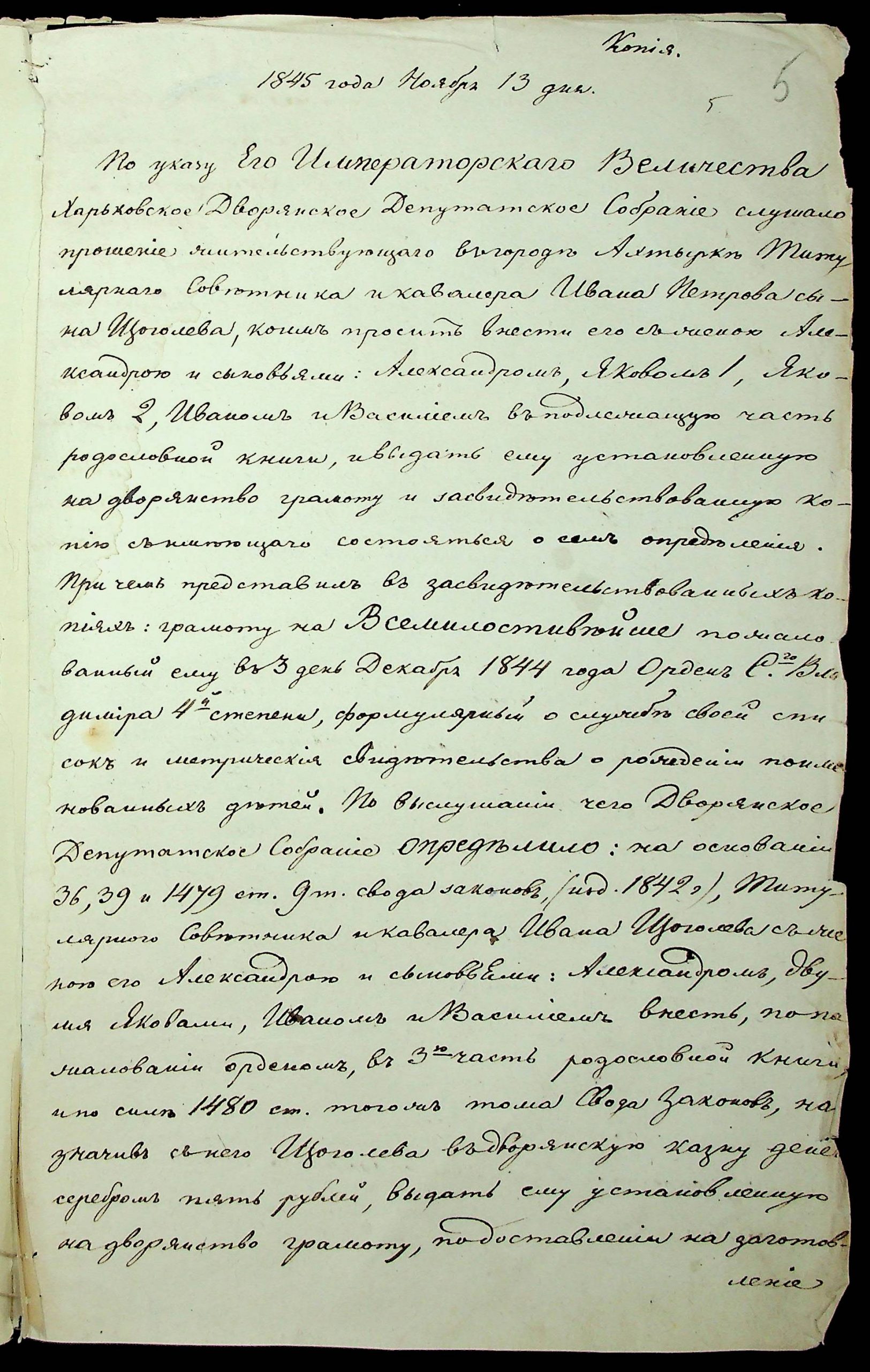 Копія рішення Харківського дворянського депутатського зібрання про внесення Івана Петровича Щоголіва та його родини до дворянської родовідної книги. 13 листопада 1843 року.Ф.667, оп.286, спр.121, арк. 5
