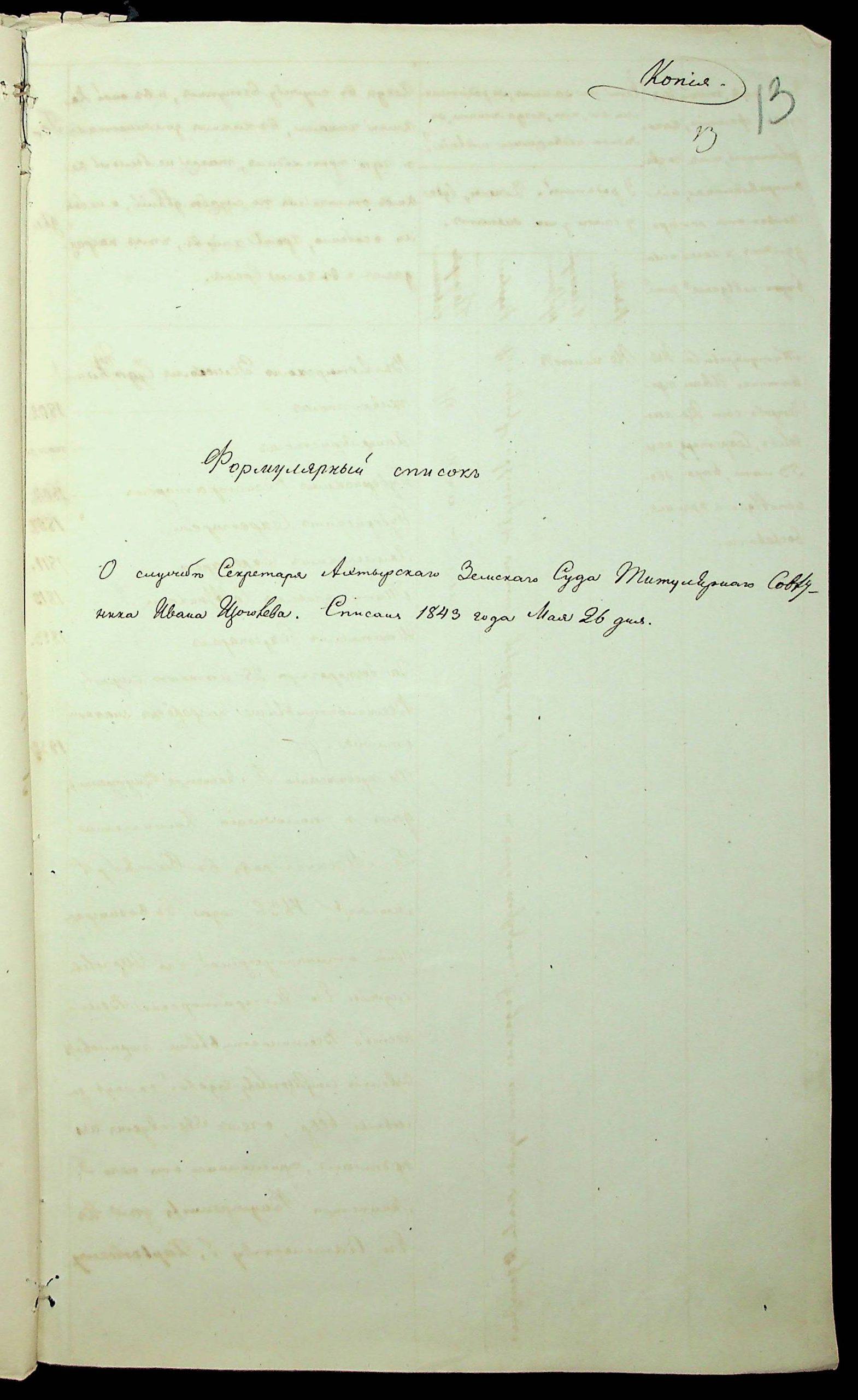 Формулярний список про службу батька Якова, секретаря Охтирського земського суду, титулярного радника Івана Щоголіва, 1843 рік. Ф.667, оп.286, спр.121, арк. 13
