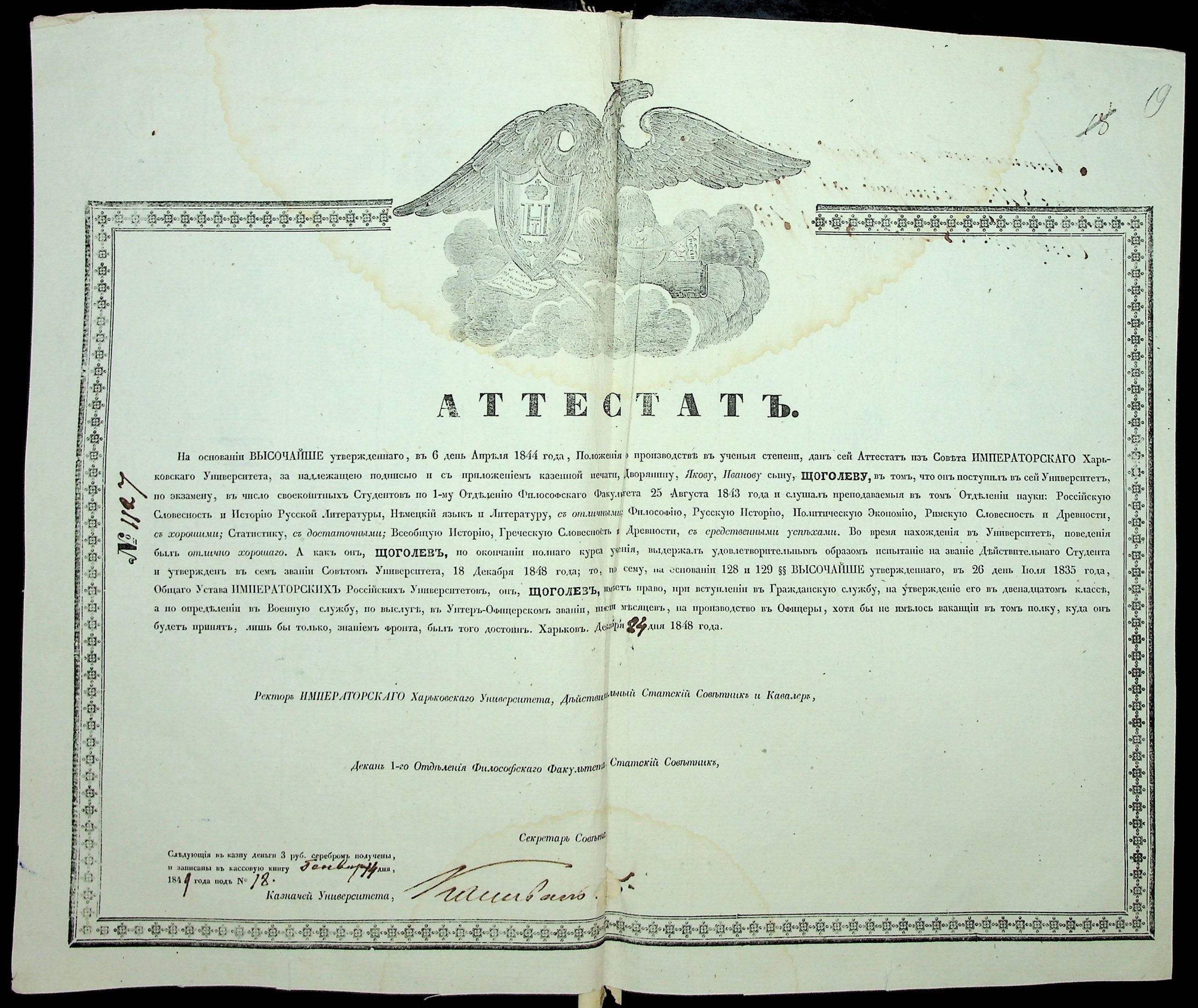 Атестат про закінчення Яковом Щоголівим Імператорського харківського університету. 1848 рік. Ф.667, оп.286, спр.121, арк. 19