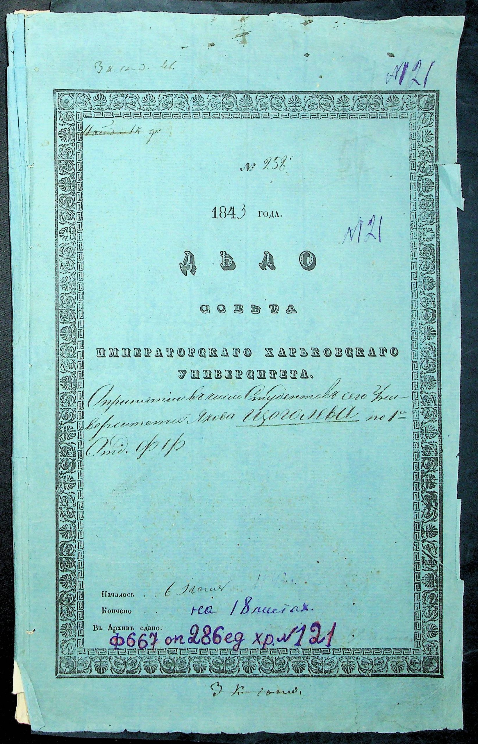 Справа про зарахування до числа студентів Імператорського харківського університету Якова Щоголіва Ф.667, оп.286, спр.121 (файл у форматі ZIP – 12,6 Мб)